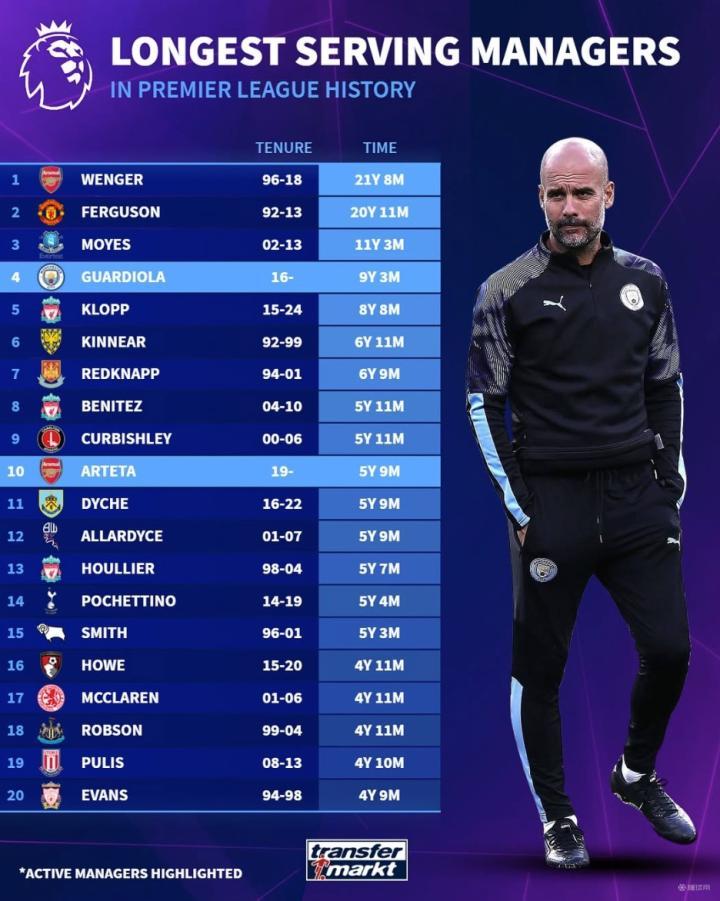 英超历史主帅在位时长:温格、弗格森前2,瓜帅第4,塔帅第10